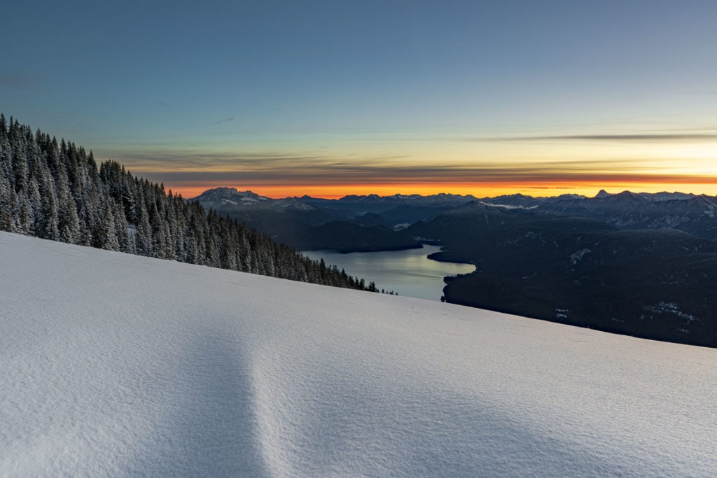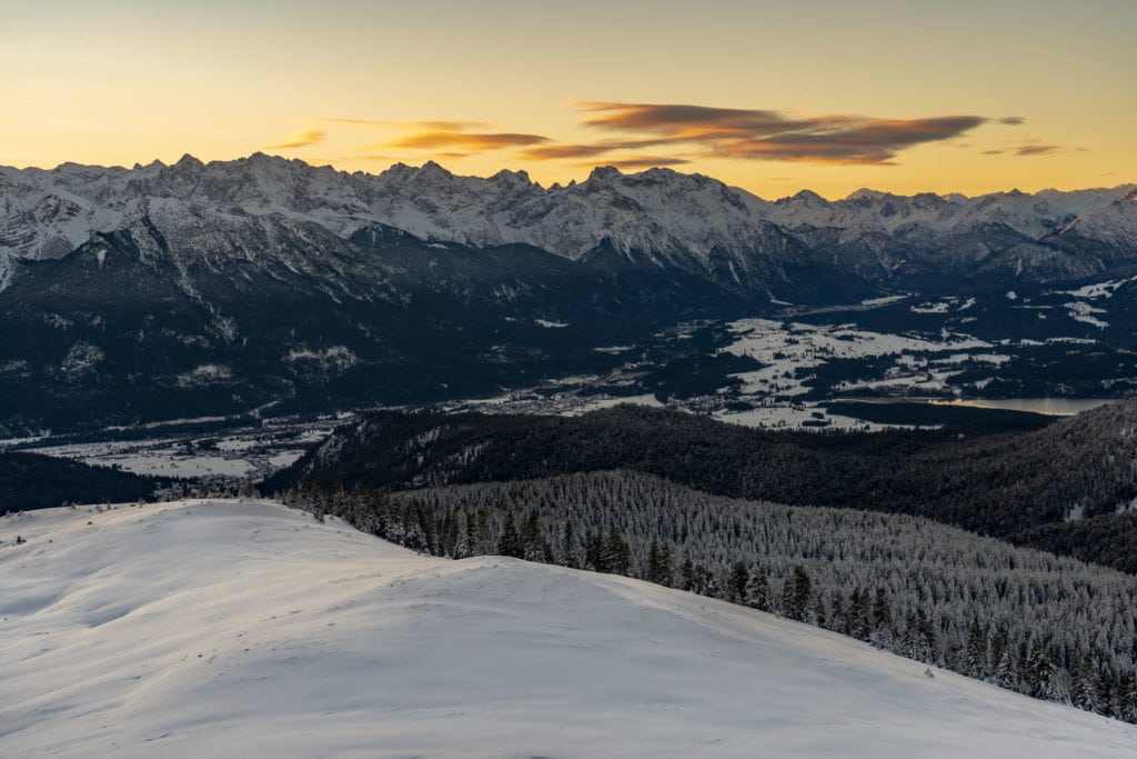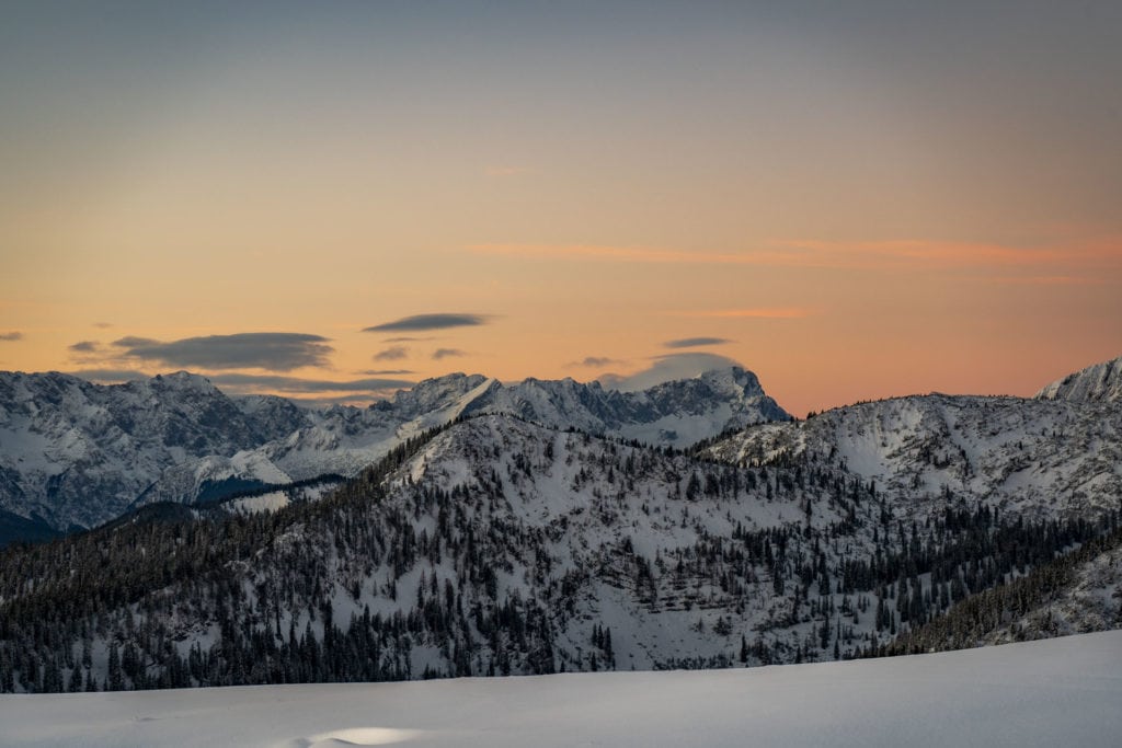 Durch einen wunderschön verschneiten Wald geht es weiter. Anschließend kommt nochmal eine super anstrengende Passage mit stellenweise über 40% Steigung. Hat man die geschafft, passiert man eine Hütte und betritt das unterhalb dem Gipfel gelegene Hochplateau. Hier liegt schon ordentlich Schnee, aber wir folgen den Fußspuren. Inzwischen ist es bereits 7:30 Uhr und die Dämmerung zeigt sich von ihrer schönsten Seite. Wir beschließen unseren Fotostop auf dem Plateau zu machen und die Lichtstimmung zu genießen. Von hier hat man einen herrlichen Blick auf Walchensee, Karwendel bis hin zur Zugspitze.